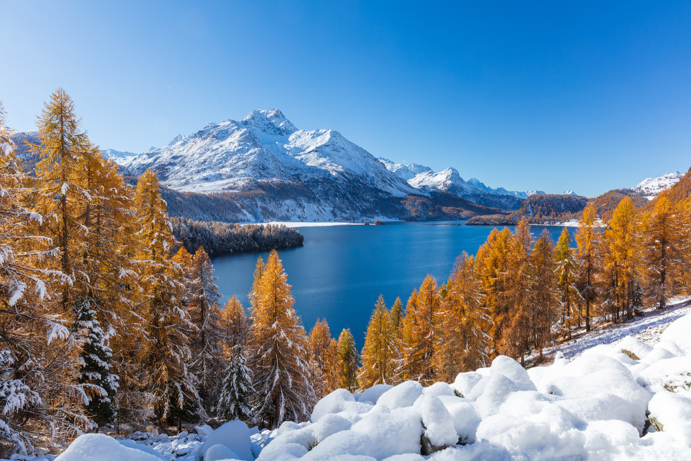 Wintereinbruch Ende Oktober in Sils im Engadin, wo die verfärbten Nadeln der Lärchen auf winterliches Weiss und das Blau des Silsersees treffen.