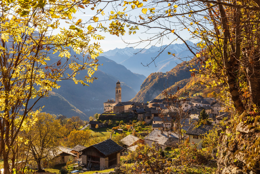 Die Nachmittagssonne scheint auf das Bergeller Bergdorf Soglio